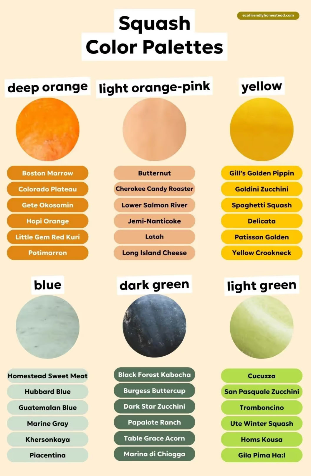 Below is a interactive sortable database of over 100 kinds of squash. Sort the list by color, time to maturity, or species. You'll also see which squash are best for drought conditions, which are grown for seed production, and which varieties are landrace seed mixes. Below this chart are more detailed descriptions of the kinds of squash and notable cultivars.
