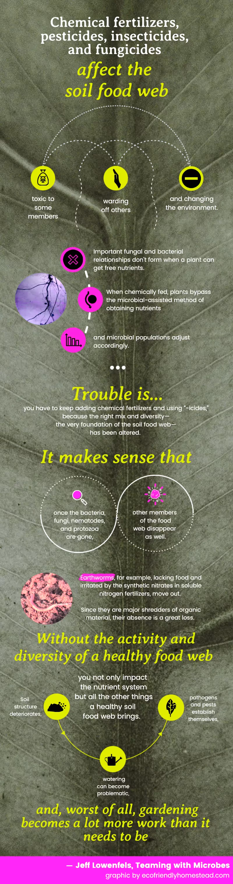 In fact, organic fertilizer actually requires soil bacteria and fungi to make the nutrients bioavailable to the plants (source). So organic fertilzer boosts soil health and microbial communities while synthetic fertilizer disrupts the soil food web.