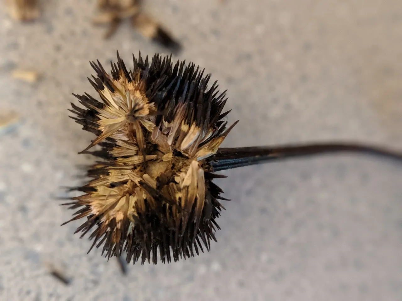 Solution: Look in the center of the seed head for the cone-shaped (thus, coneflower?) tan-colored seeds. They are hollow on the inside. The long, needle-like material that is along the outside of the echinacea seed head is not seed!