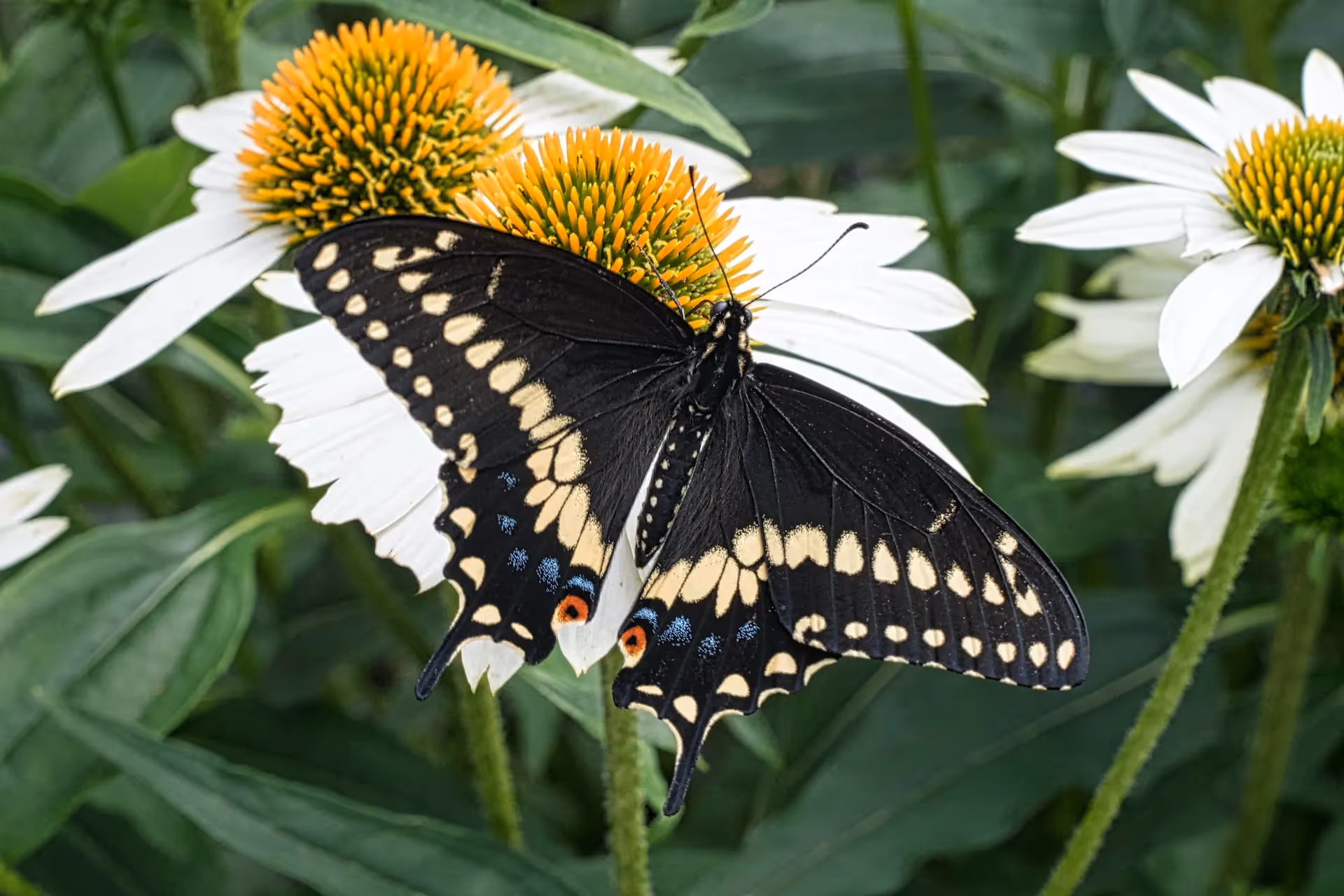 For host plants, grow fennel, dill, parsley, rue, blackberries, wild roses, citrus, spicebush, and peppers. Plant a pawpaw tree for Zebra Swallowtails. Then grow these nectar plants for adult butterflies: apple, echinacea, bee balm, zinnias, yarrow, hyssop, sunflower, and catnip.
