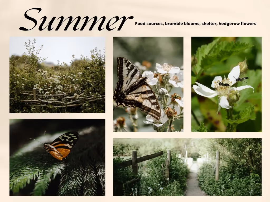 Gardener’s World suggests hedgerow trees like linden, black locust, and elderberry to offer nectar and pollen in the summer months.