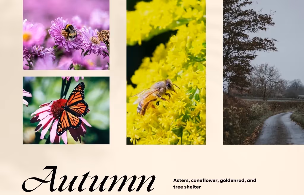 Xerces Society offers plants to grow for pollinator food sources in the fall such as echinacea, rudbeckia, native asters, and native salvia species.