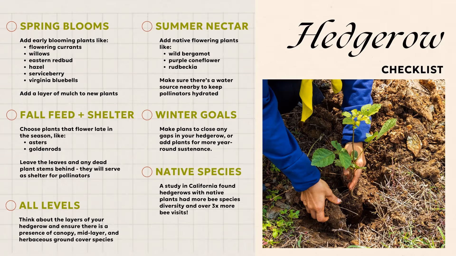 A meta-analysis found the importance of structural diversity and layering of hedgerows to correlate with pollinator population.